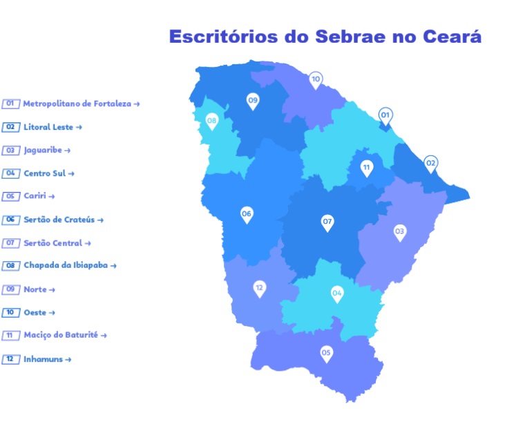 No Ceará, a instituição atende a todos os 184 municípios do estado por meio de 12 escritórios regionais, além de 170 Salas do Empreendedor, implantadas com o apoio das Administrações Municipais e instituições parceiras, onde desenvolve uma série de ações de capacitação e qualificação empresarial, mercado, estímulo à inovação e fomento a educação empreendedora, além de contribuir para melhoria do ambiente de negócios dos municípios e o desenvolvimento territorial das regiões cearenses.